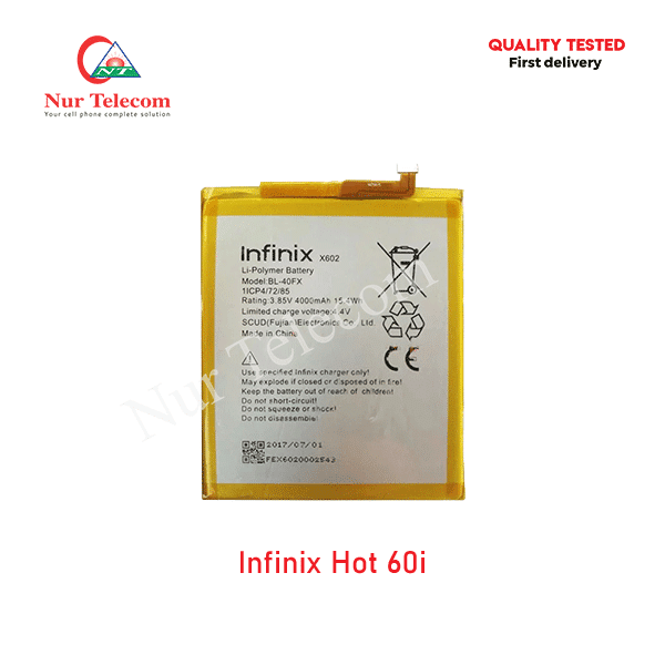 The latest Infinix Hot 60i Battery Price in Bangladesh starts from — TK. Our website, nurtelecom.com.bd, offers the cheapest price in Bangladesh for the Infinix Battery. Alternatively, you can come to our store to get this official and original brand product and receive customer support from our expert technicians at Nur Telecom. Our shop address is Shop No. 93, Basement-2, Bashundhara City Shopping Complex, Panthapath, Dhaka – 1215.