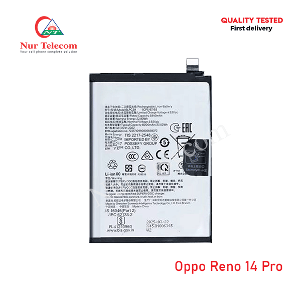 Our website, nurtelecom.com.bd, offers the cheapest price in Bangladesh for the Oppo Reno14 Pro Battery. Alternatively, you can come to our store to get this official and original brand product and receive customer support from our expert technicians at Nur Telecom. Shop Address: Shop No. 93, Basement-2, Bashundhara City Shopping Complex, Panthapath, Dhaka – 1215.