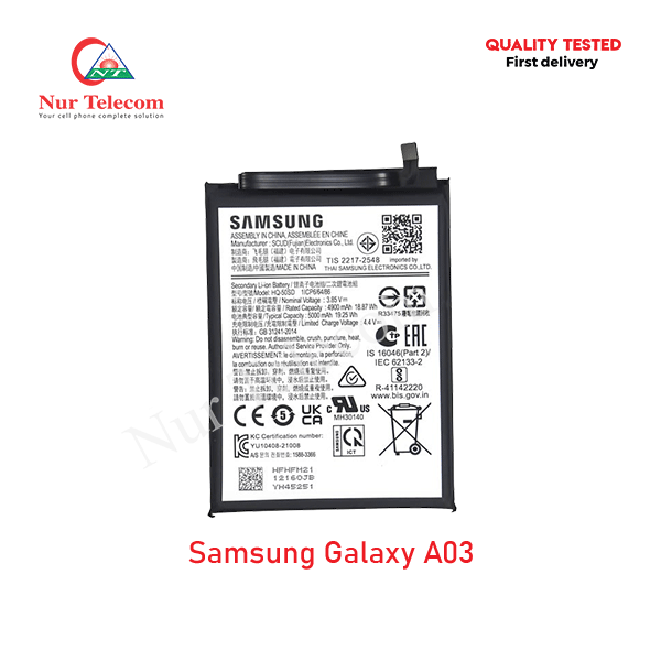 The latest Samsung Galaxy A03 Battery Price in Bangladesh starts from 899 TK. Our website, nurtelecom.com.bd, offers the cheapest price in Bangladesh for the Samsung Battery. Alternatively, you can come to our store to get this official and original brand product and receive customer support from our expert technicians at Nur Telecom. Our shop address is Shop No. 93, Basement-2, Bashundhara City Shopping Complex, Panthapath, Dhaka – 1215.