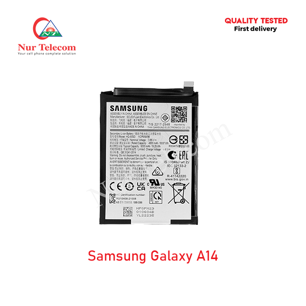 The latest Samsung Galaxy A14 Battery Price in Bangladesh starts from 899 TK. Our website, nurtelecom.com.bd, offers the cheapest price in Bangladesh for the Samsung Battery. Alternatively, you can come to our store to get this official and original brand product and receive customer support from our expert technicians at Nur Telecom. Our shop address is Shop No. 93, Basement-2, Bashundhara City Shopping Complex, Panthapath, Dhaka – 1215.